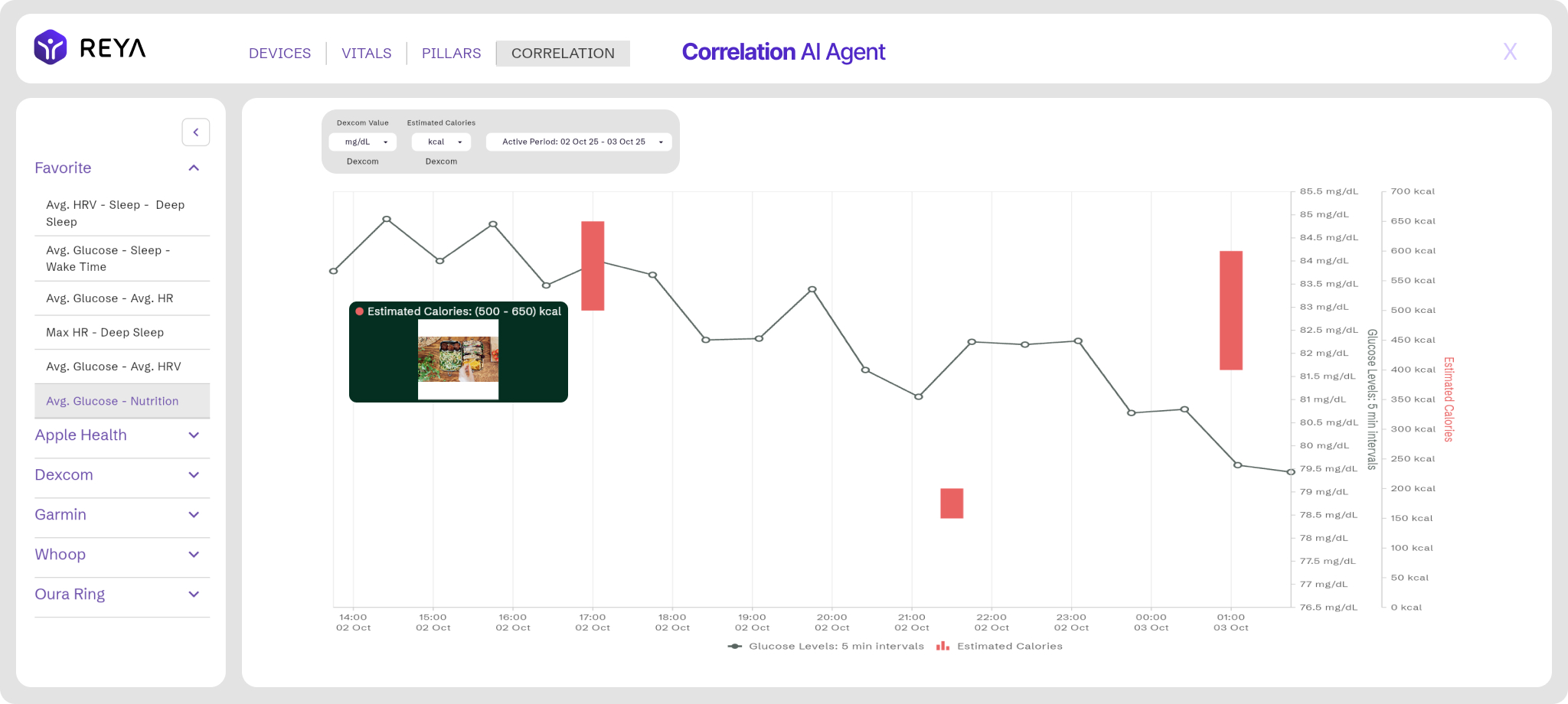 Reya's Correlation AI Agent identifies patterns that are tough to uncover, like the link between your meals and your glucose levels.
